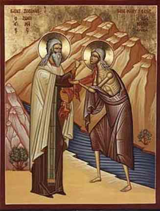 К этому времени вся одежда на Марии истлела, но старец покрыл ее своим плащом. Подвижница поведала ему всю свою жизнь, попросив никому о ней не рассказывать и прийти к ней через год на Великий Четверг со Святыми Дарами, чтобы она могла причаститься. На следующий год, исполняя просьбу Марии, старец Зосима взял Св. Дары и отправился к Иордану. На другом берегу он увидел Марию, которая, подойдя к реке, осенила воду крестным знамением и спокойно пошла по ней. С благоговейным трепетом смотрел старец на идущую по воде святую. Выйдя на берег, Мария преклонилась перед старцем и попросила его благословения. Потом выслушала «Верую» и «Отче наш», причастилась Христовых Тайн и произнесла: «Ныне отпущаеши рабу Твою по глаголу Твоему с миром!» Потом попросила Зосиму исполнить последнюю ее просьбу: прийти через год на то место, где он встретил ее впервые. Через год старец вновь отправился на то место, где спасалась Мария, но нашел ее там уже почившей. Она лежала на земле, сложив руки, как на молитве, и обратив лицо на Восток. Рядом с ней на песке было начертано: «Отец Зосима, погреби тело смиренной Марии, умершей 1 апреля. Верни прах праху». Со слезами и молитвами старец предал земле великую подвижницу и возвратился в обитель, где поведал инокам и игумену все, что услышал от преп. Марии.